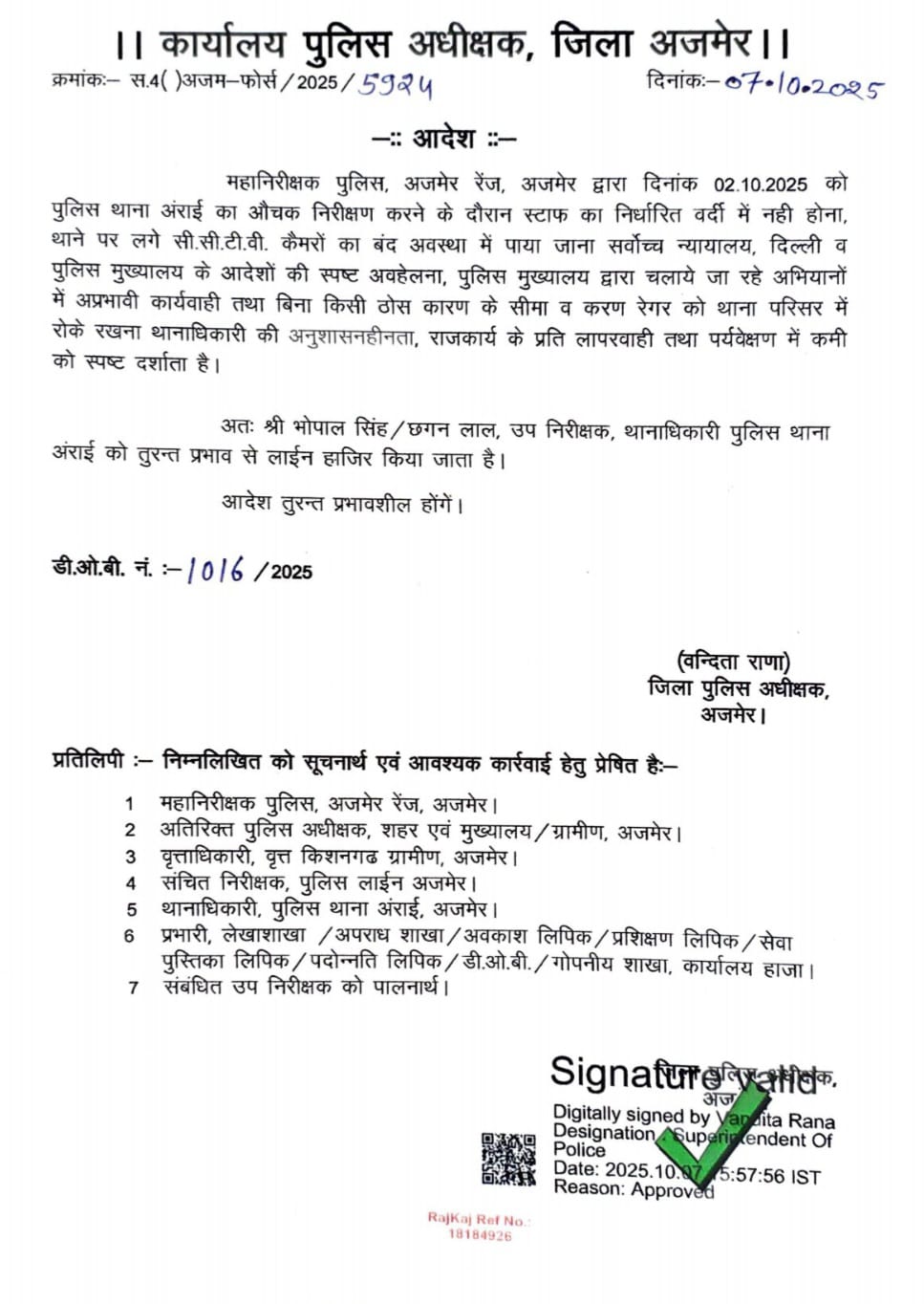 अजमेर एसपी वंदिता राणा की ओर से जारी आदेश में बताया-महानिरीक्षक पुलिस, अजमेर रेंज, अजमेर की ओर से 2 अक्टूबर को पुलिस थाना अंराई का औचक निरीक्षण किया। इस दौरान स्टाफ का निर्धारित वर्दी में नही होना, थाने पर लगे सी.सी.टी.वी. कैमरों का बंद अवस्था में पाया जाना, सर्वोच्च न्यायालय, दिल्ली व पुलिस मुख्यालय के आदेशों की स्पष्ट अवहेलना है।
