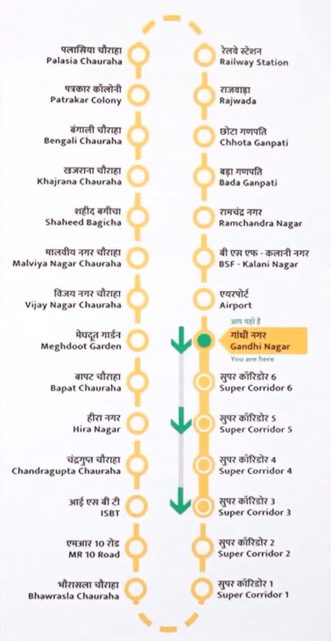 • फेज 1 : मेट्रो डिपो से लेकर सुपर कॉरिडोर स्टेशन 3 तक का पहला फेज है। कुल लंबाई 6.3 किमी की है। इसमें 5.9 किमी का प्रायोरिटी कॉरिडोर (गांधी नगर स्टेशन, सुपर कॉरिडोर स्टेशन 6, 5, 4 और 3) है। इस पर आज 31 मई से मेट्रो का कॉमर्शियल रन शुरू हो गया। इस फेज की लागत लगभग 1520 करोड़ रुपए आई है।