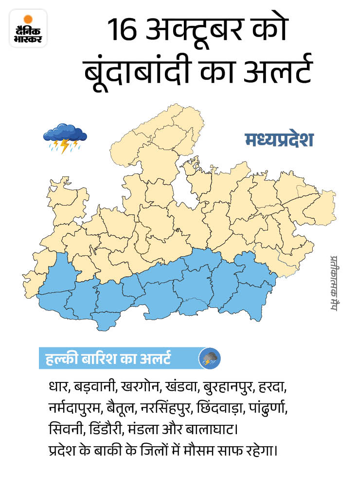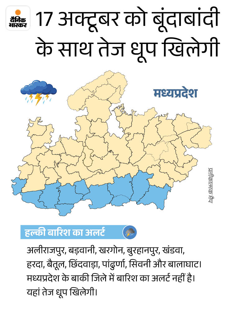 मध्यप्रदेश के दक्षिणी हिस्से में अगले 3 दिन बूंदाबांदी होने का अनुमान है। इंदौर, नर्मदापुरम और जबलपुर संभाग के 10 जिलों में असर रहेगा। वहीं, भोपाल, उज्जैन, ग्वालियर समेत बाकी के हिस्से में तेज धूप खिली रहेगी।