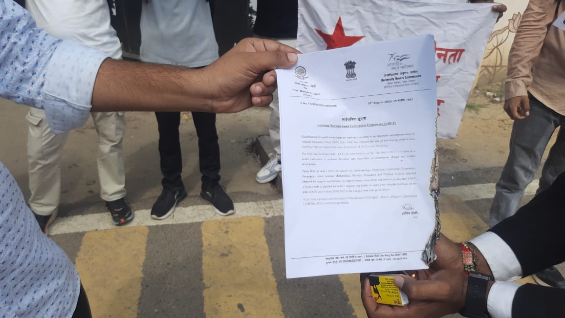 लर्निंग आउटकम्स-बेस्ड करिकुलम फ्रेमवर्क के मसौदे को जलाकर विरोध दर्ज कराया।