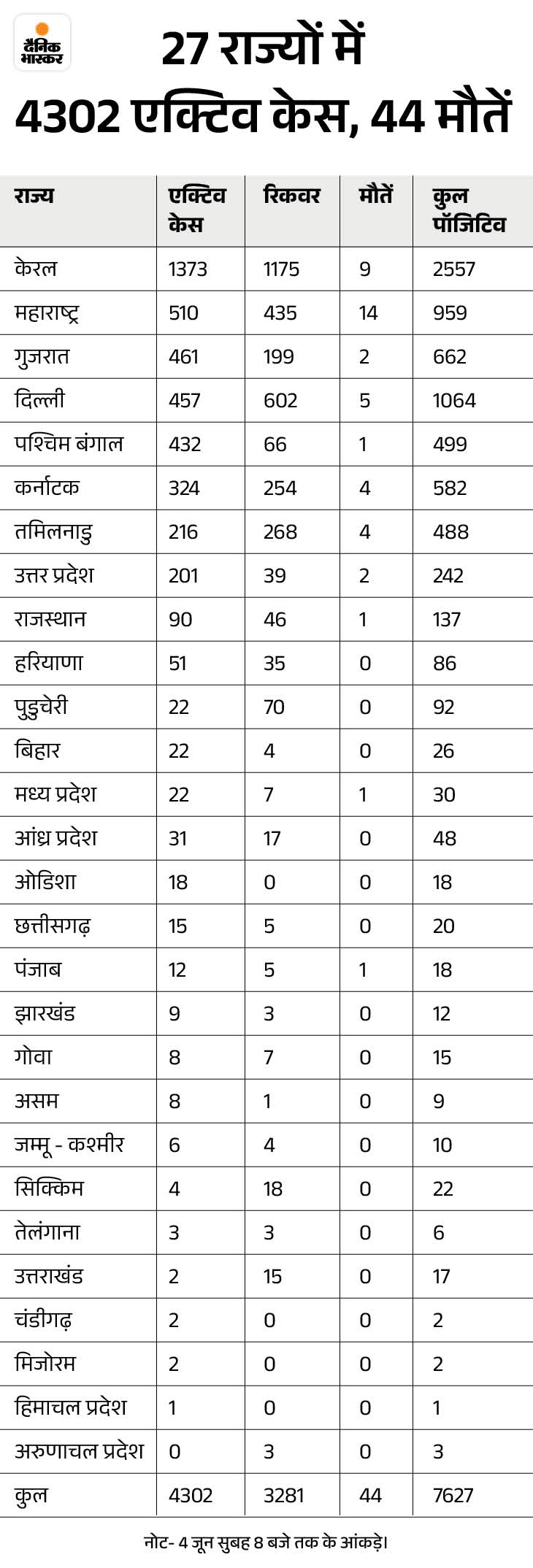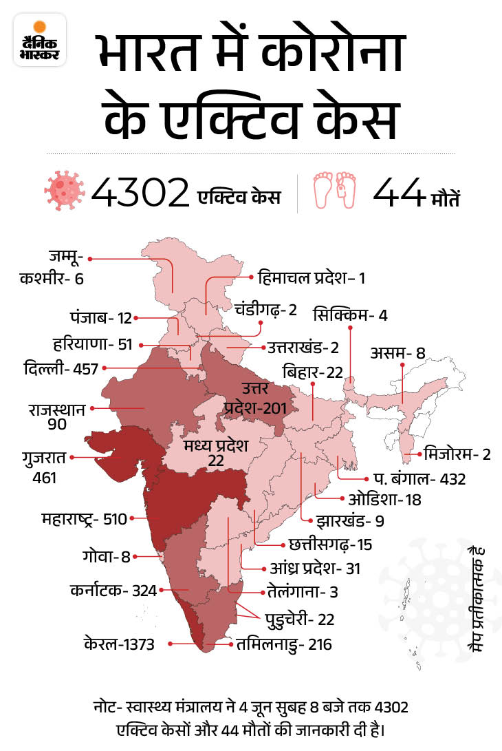देश में कोरोना के मरीजों की संख्या लगातार बढ़ती जा रही है। मंगलवार को ही 300 नए केस मिले। सबसे ज्यादा गुजरात में 108 और महाराष्ट्र में 86 मामले सामने आए। इस तरह देश में एक्टिव केसों की संख्या 4302 पहुंच गई है।