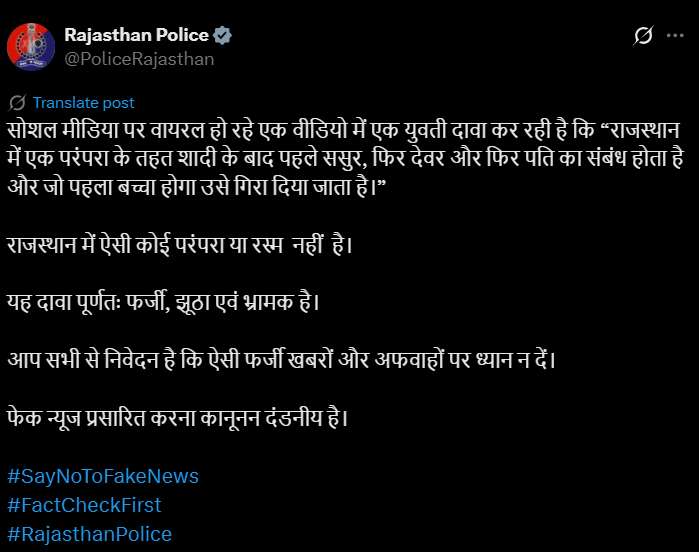 राजस्थान पुलिस ने अपने X (पूर्व में ट्विटर) अकाउंट पर पोस्ट डालकर इस दावे को भ्रामक बताया है। पुलिस का कहना है कि राजस्थान में ऐसी कोई परंपरा या रस्म नहीं है।