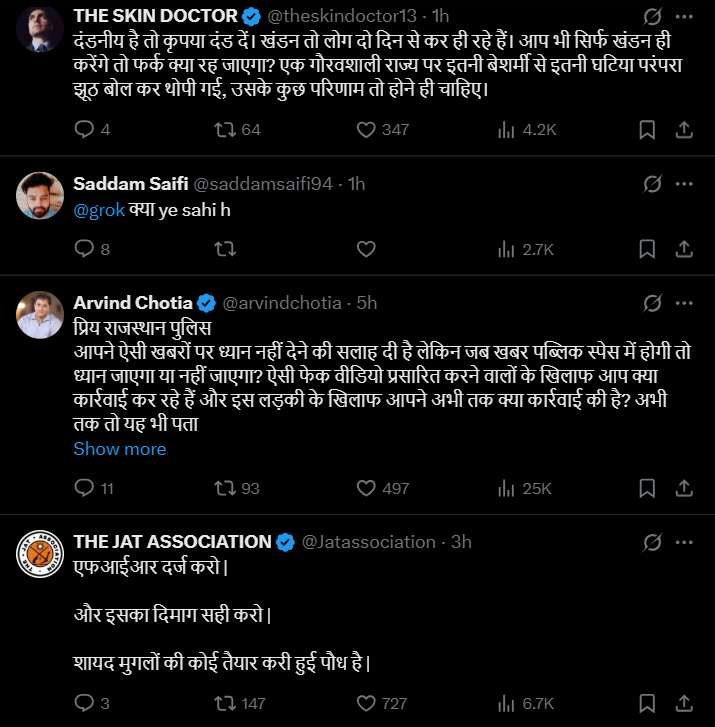 अन्य यूजर ने पूछा कि क्या यह दावा सही है। वहीं, यूजर ने राजस्थान पुलिस से पूछा कि क्या वे ऐसी खबरों पर ध्यान देंगे और फेक वीडियो प्रसारित करने वालों के खिलाफ क्या कार्रवाई करेंगे। एक अन्य यूजर ने एफआईआर दर्ज करने और उसका दिमाग सही करने की बात कही।