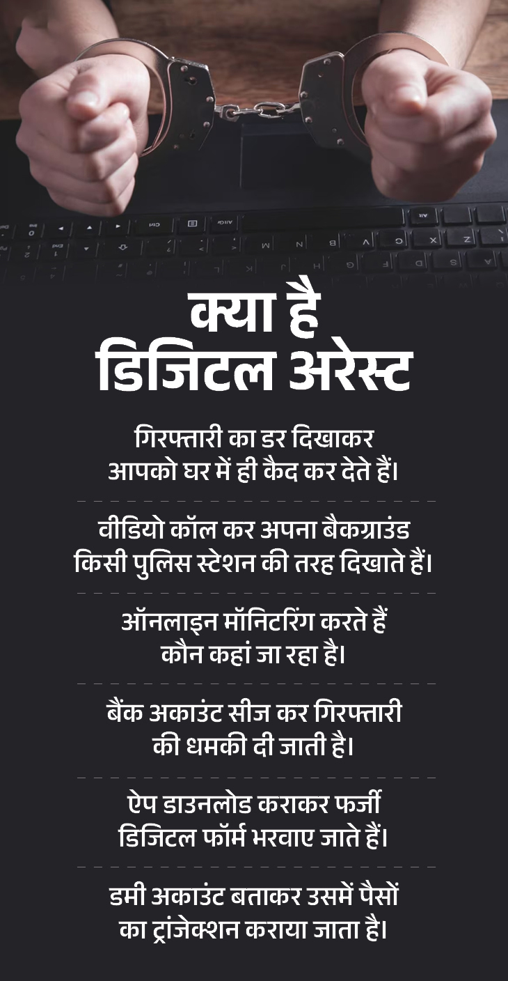 डिजिटल अरेस्ट एक तरह की ऑनलाइन ठगी है, जिसमें अपराधी खुद को पुलिस अधिकारी, कोर्ट के स्टाफ या किसी सरकारी एजेंसी का अधिकारी बताकर वीडियो कॉल, ऑडियो कॉल या ऑनलाइन मीटिंग पर लोगों को डराते हैं।