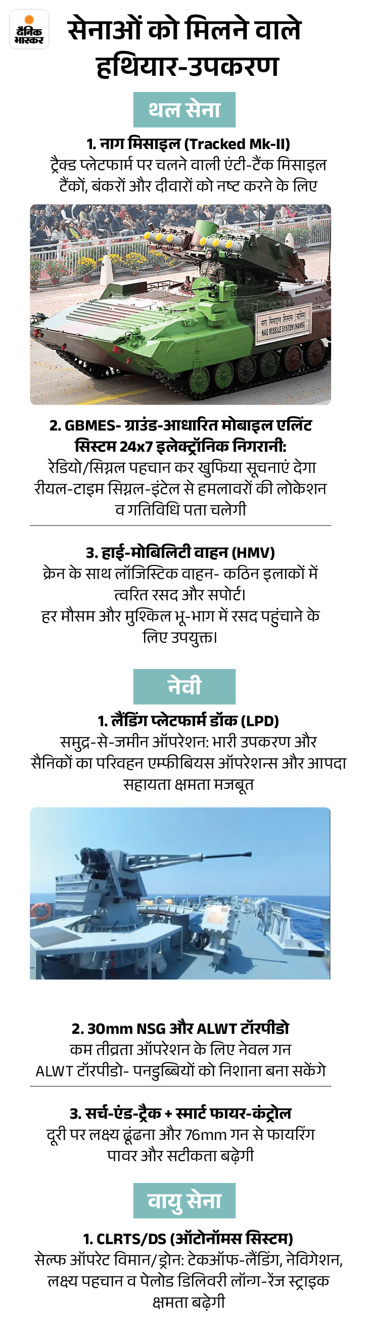 इससे नाग मिसाइल खरीदी जाएंगी, जो दुश्मन के टैंक और बंकर तबाह करने में सक्षम है। लैंडिंग प्लेटफार्म डॉक्स बनाए जाएंगे, जिससे समुद्र से जमीन पर ऑपरेशन आसान हो सके। साथ ही एडवांस लाइटवेट टारपीडो की खरीद होगी, ताकि समंदर में पनडुब्बियों को ध्वस्त किया जा सके। इसके अलावा सुपर रैपिड गन खरीदी जाएंगी।