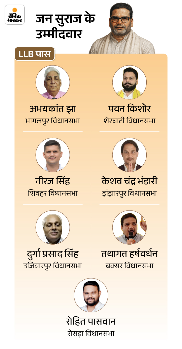 जनसुराज की दूसरी लिस्ट में साक्षर से पीएचडी तक की पढ़ाई करने वालों को जगह दी गई है। जनसुराज की लिस्ट में कुशेश्वर स्थान से कैंडिडेट बनाए गए शत्रुघ्न पासवान जहां मात्र साक्षर हैं तो तारापुर के संतोष कुमार सिंह एमडी हैं। अगर प्रोफेशन की बात करें तो पीके को सबसे ज्यादा भरोसा डॉक्टर और एडवोकेट पर है।