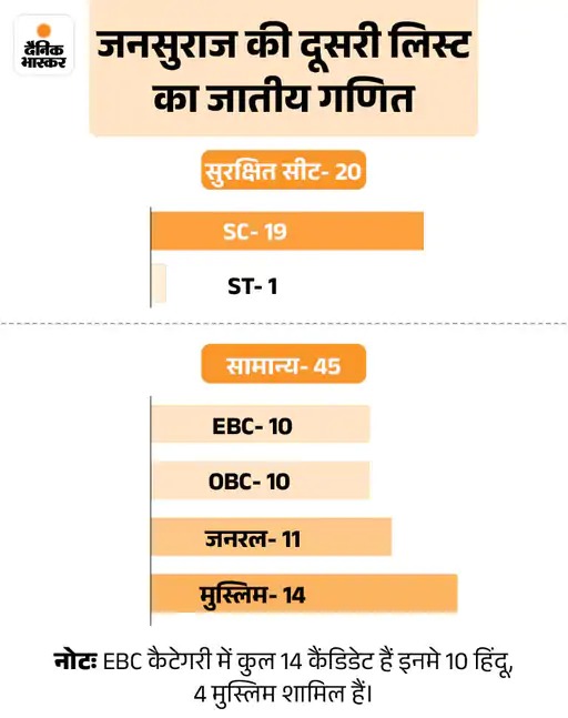 दूसरी लिस्ट में प्रशांत किशोर ने पिछड़ा और मुस्लिम पर दांव लगाया है। 65 की लिस्ट में इन्होंने 24 पिछड़ी जाति के नेताओं को कैंडिडेट बनाया है। इनमें 14 EBC और 10 OBC के हैं।