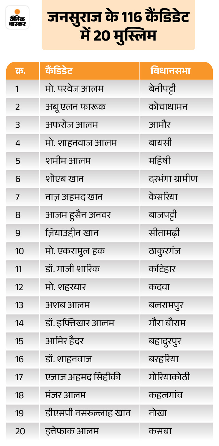 इस हिसाब से देखें तो प्रशांत किशोर ने कैंडिडेट की लिस्ट में 18% की हिस्सेदारी दी है। राज्य में मुस्लिमों की कुल आबादी लगभग 19 फीसदी है। इसे मुख्य रूप से महागठबंधन का वोट बैंक माना जाता है।