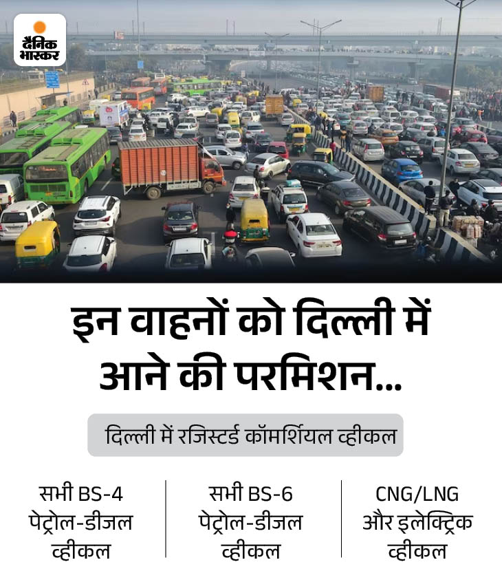 हालांकि, दूसरे राज्यों के BS-IV मानक वाले कॉमर्शियल गुड्स व्हीकल्स को 31 अक्टूबर, 2026 तक दिल्ली में एंट्री की परमिशन होगी। दिल्ली में रजिस्टर्ड कॉमर्शियल गुड्स व्हीकल्स के साथ-साथ CNG, LNG या इलेक्ट्रिक व्हीकल्स की एंट्री पर कोई रोक नहीं होगी।