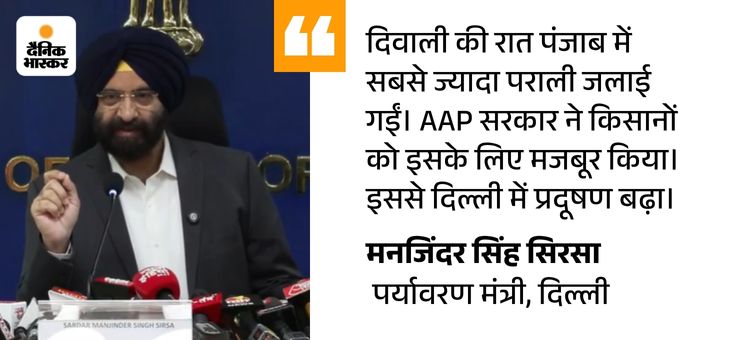 दिल्ली की भाजपा सरकार में पर्यावरण मंत्री मनजिंदर सिंह सिरसा ने मंगलवार को पंजाब सरकार को प्रदूषण बढ़ने का जिम्मेदार ठहराया। उन्होंने एक प्रेस कॉन्फ्रेंस में पंजाब में पराली जलाने के वीडियो दिखाते हुए कहा- पंजाब की AAP सरकार ने किसानों को खेतों में पराली जलाने के लिए मजबूर किया, जिससे दिल्ली की हवा खराब हुई।