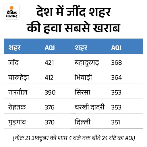 दिवाली के बाद देश में हरियाणा की हवा सबसे प्रदूषित हुई है। CPCB के अनुसार, सबसे ज्यादा प्रदूषित हवा वाले 10 शहरों में हरियाणा के 8 और राजस्थान का एक शहर है। वहीं दिल्ली 10वें नंबर पर है।