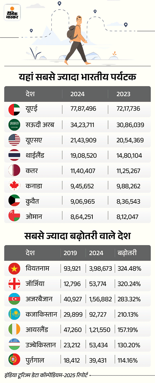 - यूएई का अबुधाबी, वियतनाम का हनोई, इंडोनेशिया का बाली सबसे फेवरेट डेस्टिनेशन के तौर पर उभरे हैं। टॉप-10 देशों के अलावा करीब 51 लाख भारतीय नई डेस्टिनेशन पर गए, जिसमें न्यूजीलैंड, पुर्तगाल, पोलैंड और उज्बेकिस्तान जैसे देश शामिल हैं।