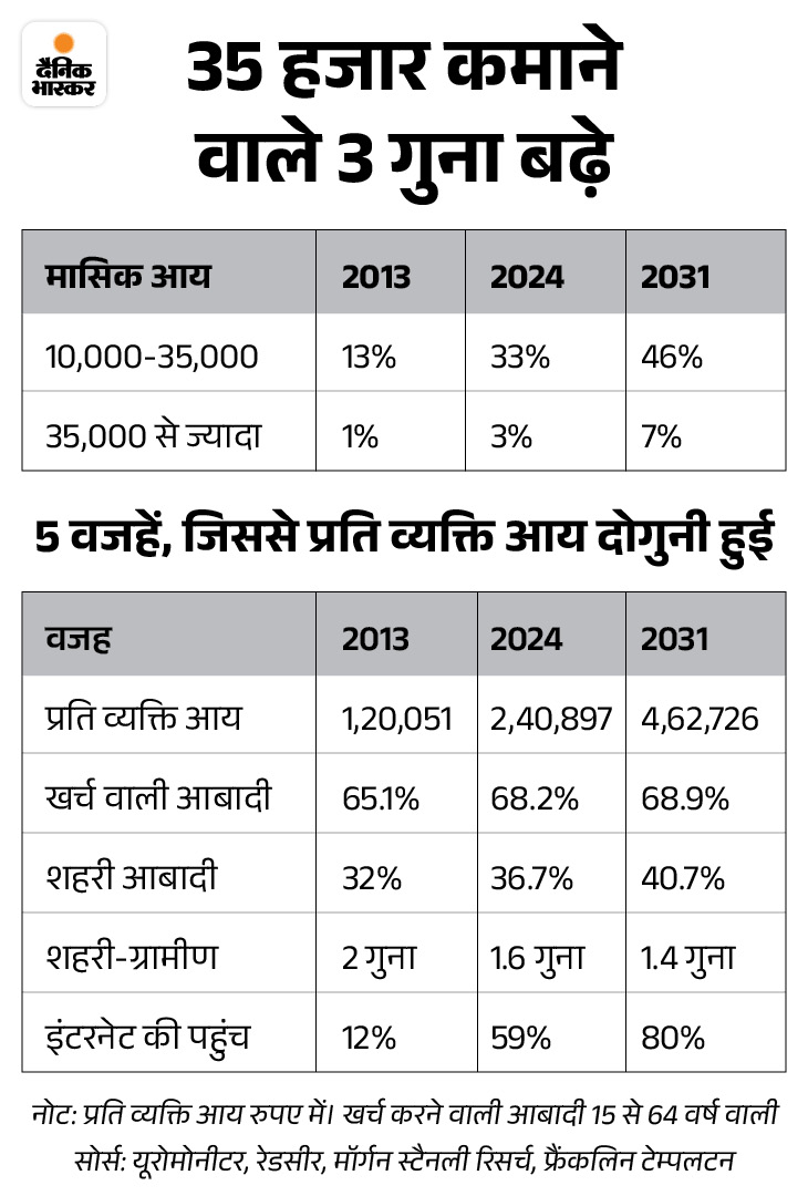 रिपोर्ट में बताया गया है कि 2013 में ऐसे परिवार 6 करोड़ थे। ये लोग कुल खपत का 40% हिस्सा संभालेंगे। इससे कार, मकान, एफएमसीजी प्रोडक्ट्स की बिक्री तेजी से बढ़ेगी। इसके अलावा, 2010-2024 के बीच प्रति व्यक्ति आय दोगुनी होकर सालाना ₹2.41 लाख हो गई। 2031 तक यह ₹4.63 लाख हो जाएगी। इससे लोग प्रीमियम सामान, पर्यटन और सेहत पर जरूरतों से ज्यादा खर्च करेंगे।