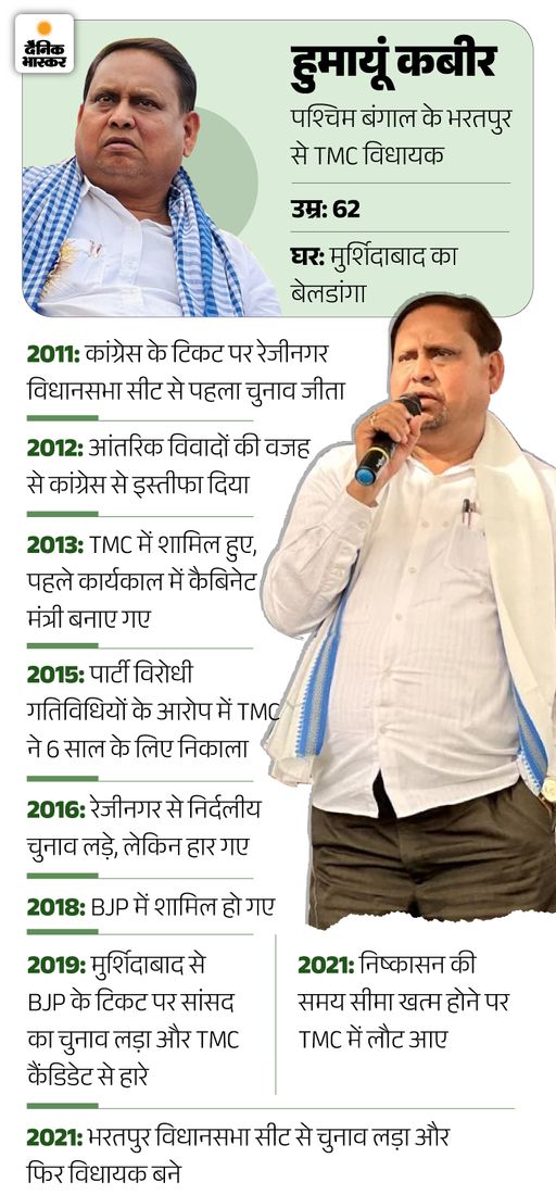 4 दिसंबर: मामला बढ़ता देखा TMC ने विधायक हुमायूं कबीर को सस्पेंड कर दिया। कोलकाता मेयर फिरहाद हकीम ने कहा- पार्टी सांप्रदायिक राजनीति में विश्वास नहीं करती। पार्टी एक्शन पर हुमायूं ने कहा- मैं अपने बाबरी मस्जिद वाले बयान पर कायम हूं। 22 दिसंबर को अपनी नई पार्टी की भी घोषणा करूंगा। विधानसभा चुनाव में 135 सीटों पर उम्मीदवार उतारूंगा। मैं उन दोनों (TMC और भाजपा) के खिलाफ चुनाव लड़ूंगा।
