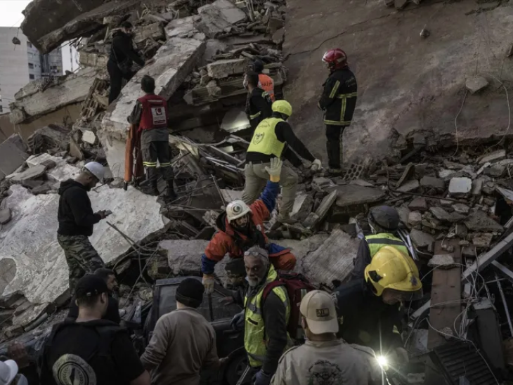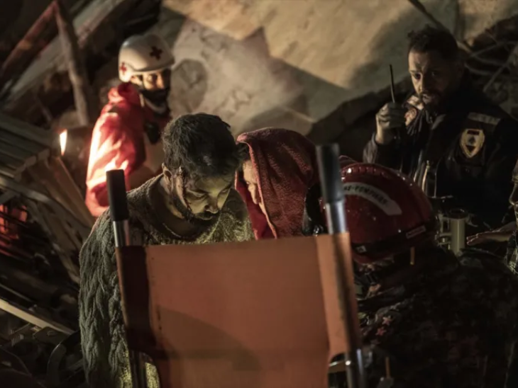 लेबनान के राहतकर्मियों ने इजराइली हमलों के बाद तबाह इमारतों के मलबे से एक महिला का रेस्क्यू किया।