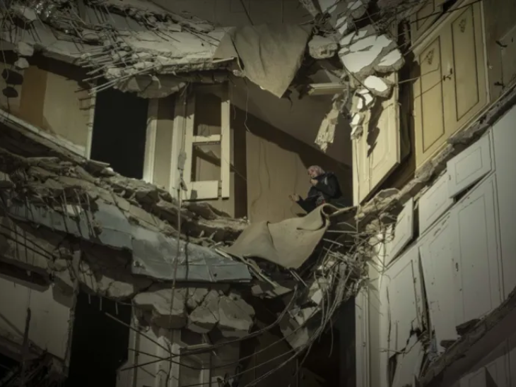 लेबनान के बेरूत के दक्षिणी इलाके में बुधवार को इजराइली हमलों के बाद एक आदमी टूटी हुई इमारत को देखते हुए।
