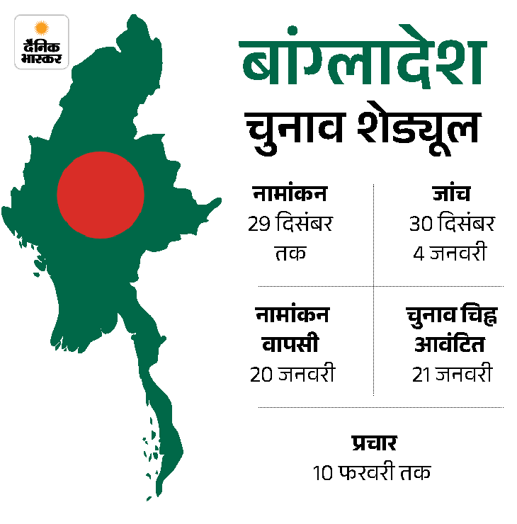 बांग्लादेश में अगले साल 12 फरवरी को आम चुनाव होंगे। देश के मुख्य चुनाव आयुक्त एएमएम नासिरउद्दीन ने गुरुवार शाम इसका ऐलान किया। यह चुनाव पूर्व पीएम शेख हसीना के तख्तापलट के डेढ़ साल बाद हो रहा है।