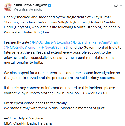 उन्होंने लिखा, “हम सरकार से अपील करते हैं कि छात्र के शव को जल्द से जल्द भारत लाया जाए और दोषियों को कड़ी से कड़ी सजा मिल सके।”