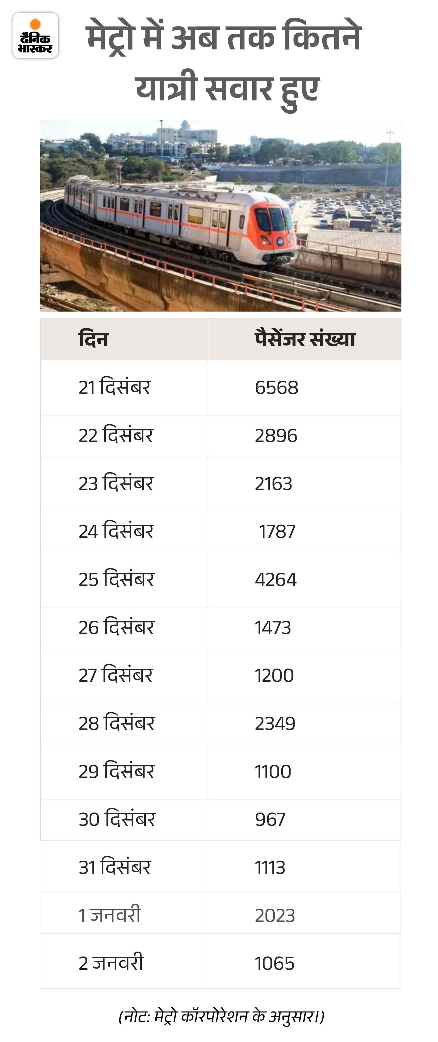 इसके बाद पैसेंजर की संख्या घटती गई। 22, 23 ओर 28 दिसंबर को पैसेंजर 2 हजार से ज्यादा थी। वहीं, 25 दिसंबर को क्रिसमस की छुट्टी होने से 4264 लोगों ने मेट्रो में सवार किया था। 30 दिसंबर को सबसे कम 967 पैसेंजर मेट्रो में बैठे थे। वहीं, नए साल के पहले दिन 2023 और दूसरे दिन 1065 यात्रियों ने सफर किया। यात्रियों की कम संख्या की वजह से ही मेट्रो के समय और ट्रिप दोनों में बदलाव कर दिया गया।