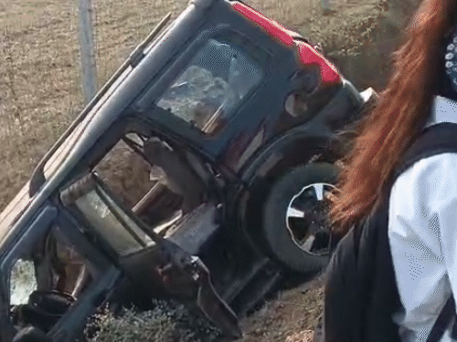 हादसे के बाद खाई में गिरी जीप और उसके पास पड़ा पहिया।