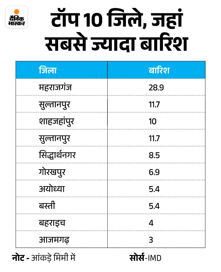 लखनऊ में बारिश हुई। 50 किमी प्रति घंटे की स्पीड से आंधी चली। कौशांबी और उन्नाव में भी बूंदाबांदी हुई। अमेठी में 30 मिनट बारिश हुई।