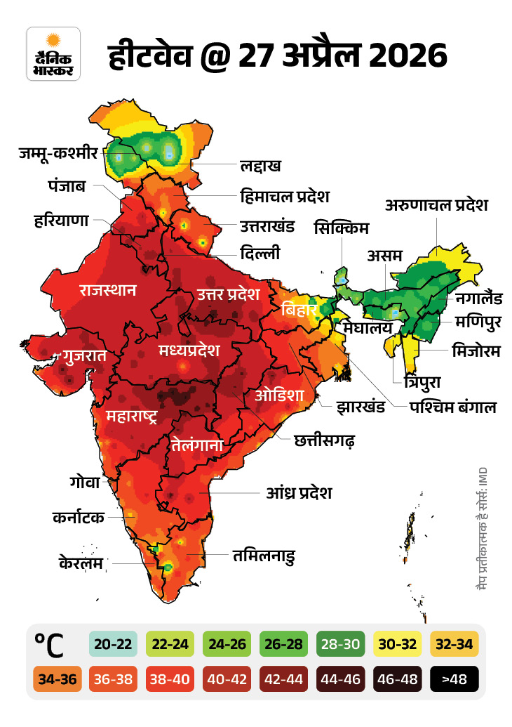 - मध्य प्रदेश, राजस्थान, गुजरात, उत्तर प्रदेश, बिहार, छत्तीसगढ़, ओडिशा, हरियाणा, दिल्ली, हिमाचल प्रदेश, पंजाब और महाराष्ट्र में हीटवेव का अलर्ट है।