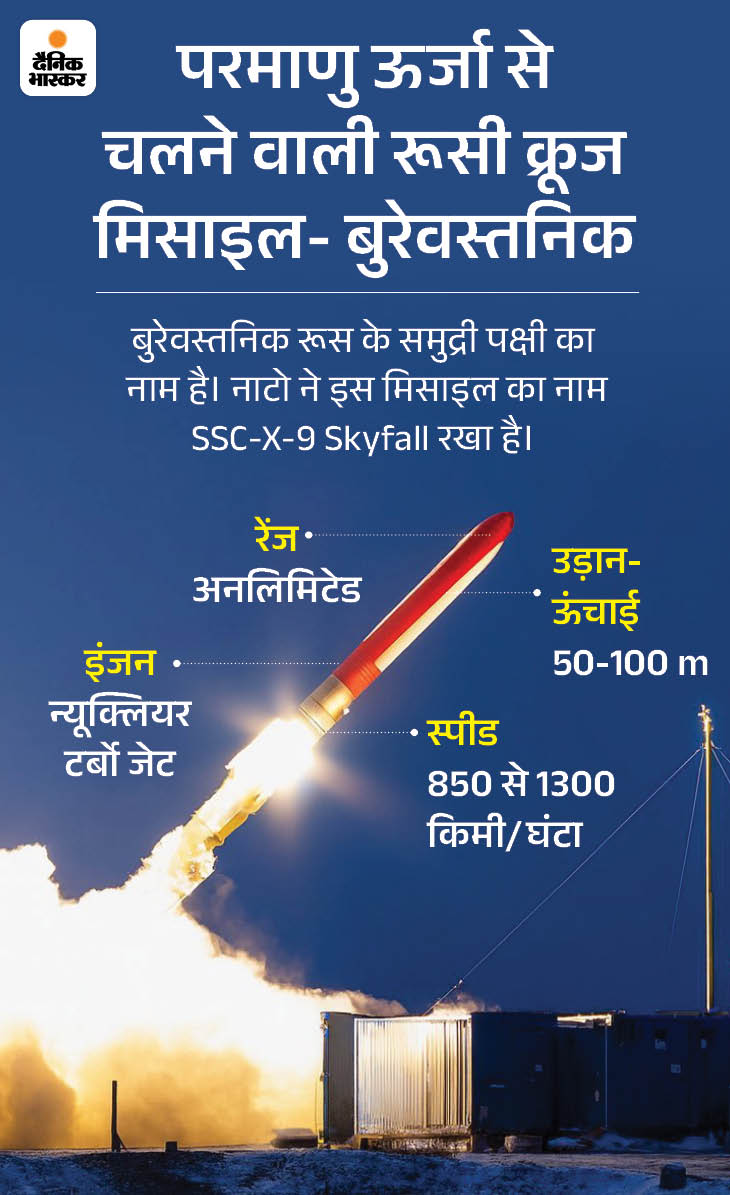 रूस ने दुनिया की पहली न्यूक्लियर पावर्ड यानी परमाणु ऊर्जा से चलने वाली क्रूज मिसाइल बुरेवस्तनिक-9M739 का सफल परीक्षण किया है। राष्ट्रपति व्लादिमीर पुतिन ने रविवार को वीडियो कॉन्फ्रेंस के दौरान कहा कि इसके सभी टेस्ट पूरे हो चुके हैं।