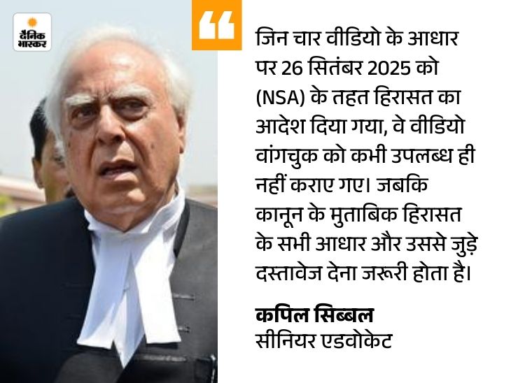 सिब्बल ने यह भी कहा कि हिरासत के आधार वांगचुक को करीब 28 दिन की देरी से दिए गए, जो संविधान के अनुच्छेद 22 का स्पष्ट उल्लंघन है। अनुच्छेद 22 मनमानी गिरफ्तारी और हिरासत से नागरिकों की सुरक्षा करता है। उन्होंने दलील दी कि अगर हिरासत के आधार और सबूत समय पर नहीं दिए जाएं, तो हिरासत का आदेश अपने-आप गलत हो जाता है।