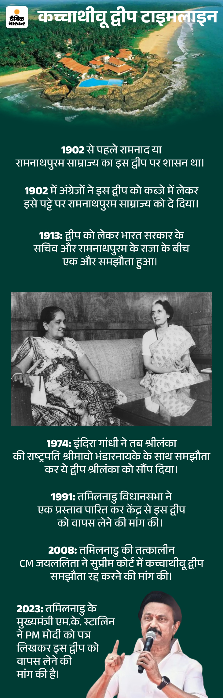 श्रीलंका के विदेश मंत्रालय की वेबसाइट के मुताबिक कच्चाथीवू 285 एकड़ में फैला एक द्वीप है। ये द्वीप बंगाल की खाड़ी और अरब सागर को जोड़ता है। 1974 में इंदिरा गांधी की सरकार ने इस द्वीप को श्रीलंका को गिफ्ट कर दिया था।