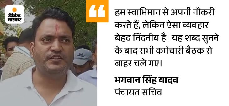 चाहे किसी सांसद-विधायक का आदमी हो, जूते मारेंगे पंचायत सचिव भगवान सिंह यादव ने आरोप लगाया कि सीईओ ने गाली-गलौज करते कहा कि चाहे किसी सांसद या विधायक का आदमी हो, जूते मारेंगे। इस पर पंचायत सचिव और रोजगार सहायक बैठक का बहिष्कार कर बाहर निकल गए।