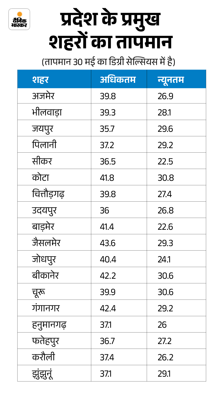पिछले 24 घंटे के दौरान सबसे ज्यादा तापमान जैसलमेर में 43.6 डिग्री सेल्सियस दर्ज हुआ। गंगानगर में अधिकतम तापमान 42.4 डिग्री सेल्सियस, बीकानेर में 42.2, बाड़मेर में 41.4, कोटा में 41.8 डिग्री रिकॉर्ड हुआ।