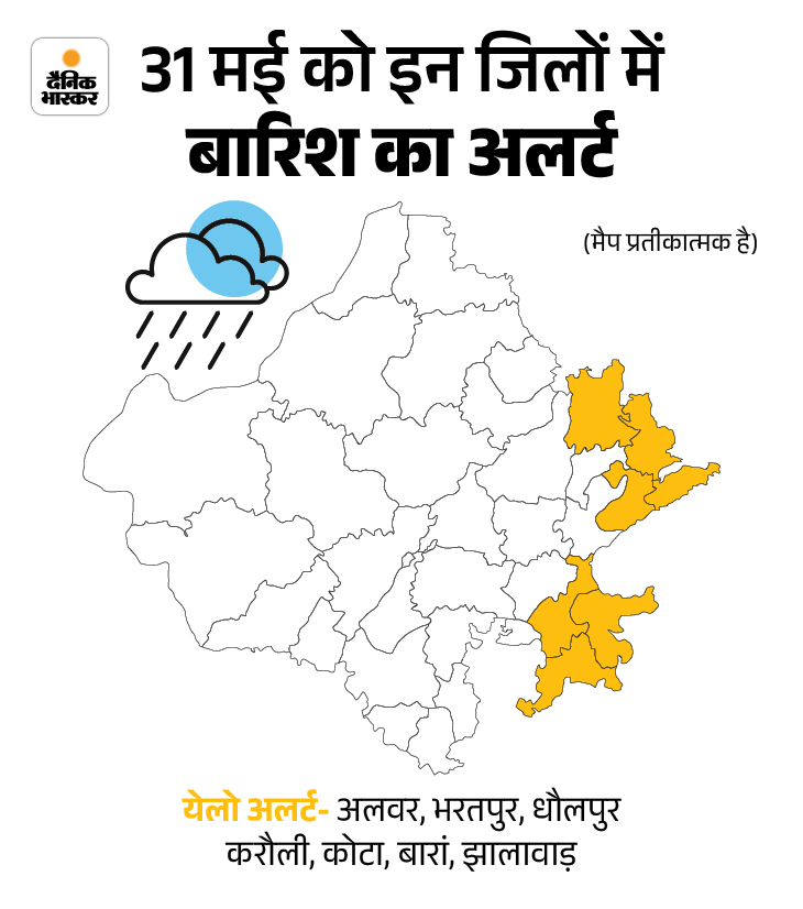 वहीं, 2 जून को एक वेस्टर्न डिस्टर्बेंस एक्टिव होगा, जिसके असर से 2-3 जून को राजस्थान के कई जिलों में आंधी-बारिश की गतिविधियां फिर से बढ़ेगी। जो 4 जून तक जारी रहेगा।