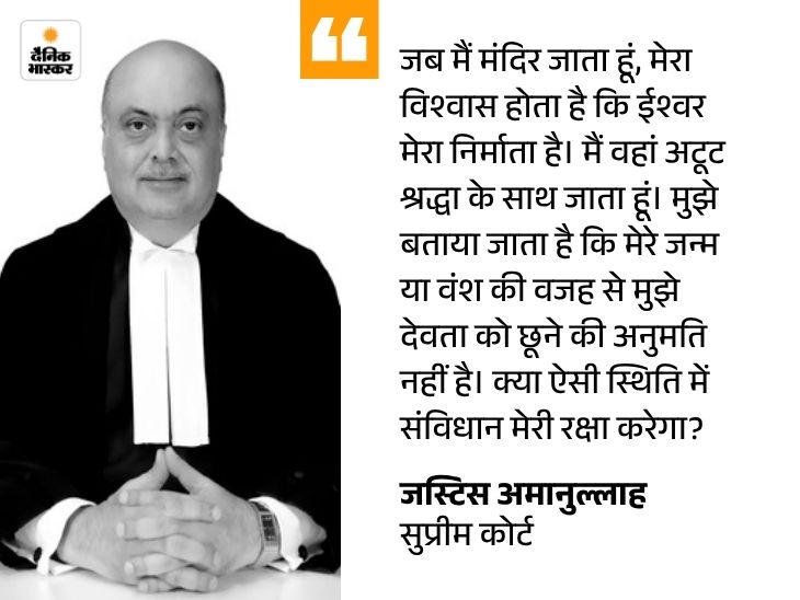 जस्टिस सुंदरेश: एक आस्तिक, जो उस संप्रदाय का सदस्य भी है, उसके अधिकारों और उस संप्रदाय के बीच किसी भी तरह के टकराव की कल्पना नहीं की जा सकती। अगर किसी धार्मिक संप्रदाय के अंदर ही यह विचार-मंथन चल रहा हो कि किसी खास प्रथा को छोड़ देना चाहिए या उसमें बदलाव करना चाहिए… तब ? जस्टिस अमानुल्लाह: जब आप आस्था और विश्वास के मार्ग पर इतना आगे बढ़ जाते हैं, तो मेरा मूल विश्वास यह होता है कि वही ईश्वर हैं, वही मेरे रचयिता हैं, उन्होंने ही मुझे बनाया है, है ना? मैं पूरी तरह से समर्पित हूं; मेरे हृदय में कोई अशुद्धि नहीं है। मैं वहां जाता हूं और वहां मुझे यह कहा जाता है कि मेरे जन्म, मेरे वंश, किसी विशेष परिस्थिति के कारण मुझे उस देवता को छूने की अनुमति नहीं है। अब, क्या ऐसे में संविधान मेरी रक्षा के लिए आगे नहीं आएगा?