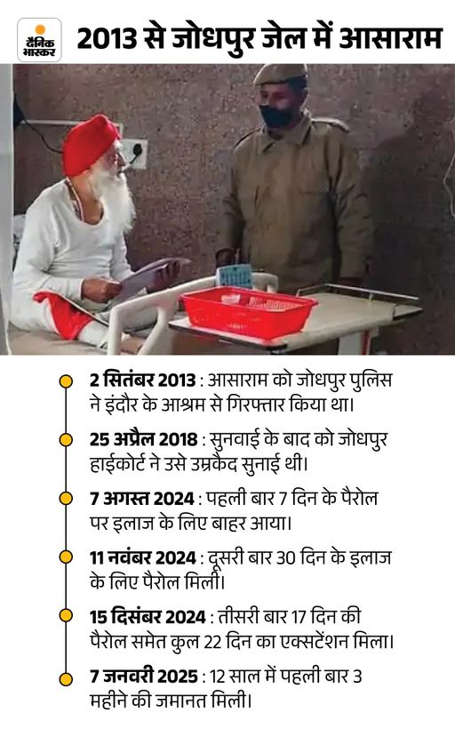 10 जुलाई को मिली थी जमानत जोधपुर की जेल में उम्रकैद की सजा काट रह आसाराम को इसी साल 10 जुलाई को सुप्रीम कोर्ट से बेल मिली थी। बेल मेडिकल ग्राउंड पर दी गई थी। इसके साथ ही सुप्रीम कोर्ट ने आदेश दिया था कि आगे की बेल बढ़ाने के लिए आसाराम गुजरात हाईकोर्ट में अपील कर सकता है। इसके बाद बाद गुजरात हाईकोर्ट ने आसाराम की बेल 3 सितंबर तक के लिए बढ़ा दी थी। इसके बाद आसाराम ने फिर से जमानत की याचिका लगाई, जिसे कोर्ट ने खारिज कर दिया था। इसके बाद आसाराम ने जोधपुर जेल में सरेंडर कर दिया था।