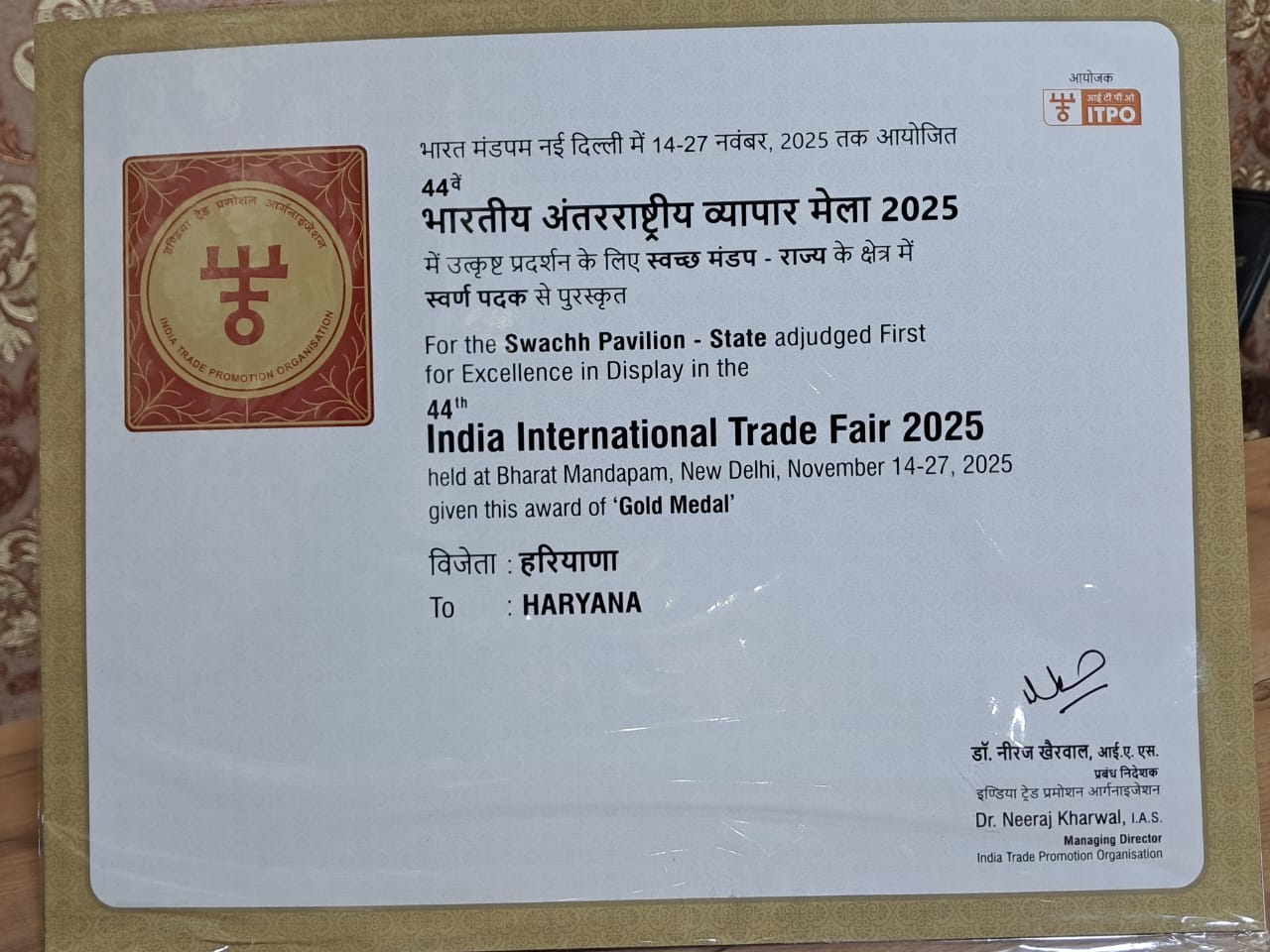 नई दिल्ली के भारत मंडपम में चले अंतरराष्ट्रीय व्यापार मेले-2025 में हरियाणा को स्वच्छ मंडप में गोल्ड मेडल मिला है। व्यापार मेले में अलग-अलग श्रेणियों में मेडल दिए गए थे, इसमें हरियाणा प्रदेश के पवेलियन ने स्वच्छ मंडप में बाजी मारी है। मंडप के निदेशक