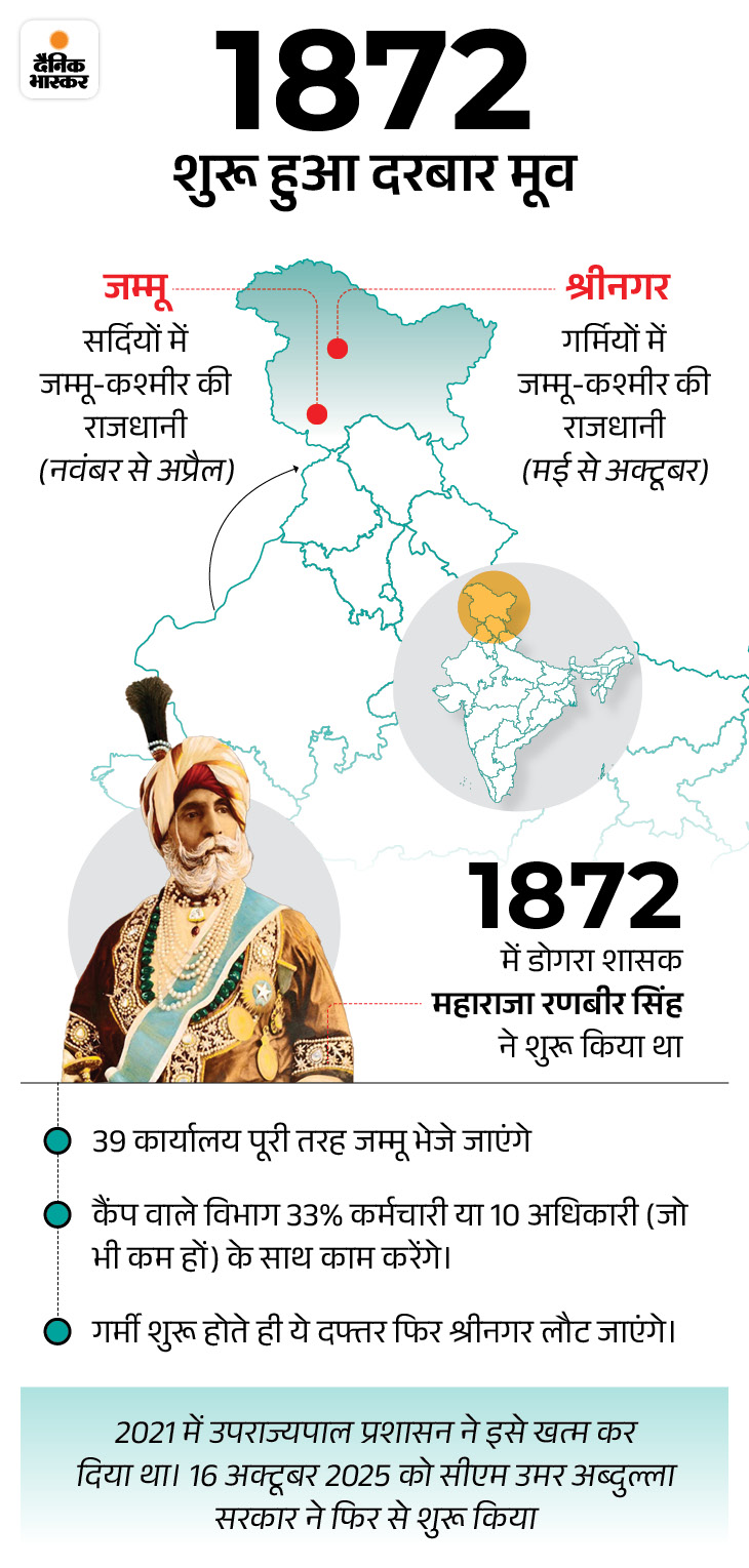 जम्मू-कश्मीर में ‘दरबार मूव’ की 150 साल पुरानी परंपरा 4 साल बंद रहने के बाद इस बार फिर लौटी है। शुक्रवार को सरकारी दफ्तर बंद होने के बाद सामान और कर्मचारियों के श्रीनगर से जम्मू रवाना होने का सिलसिला शुरू हो गया। सरकारी कार्यालय 3 नवंबर से जम्मू में काम शुरू करेंगे और 6 महीने वहीं रहेंगे।