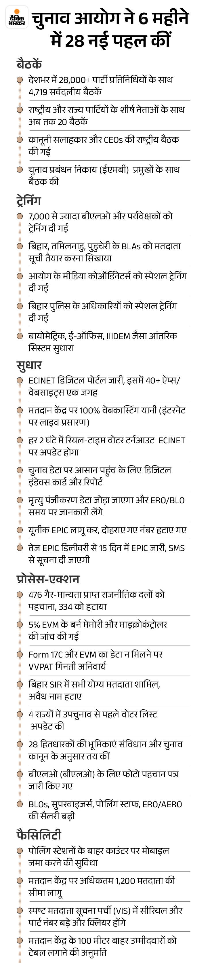 निर्वाचन आयोग ने बताया कि इनके अलावा मतदाताओं की सुविधा और चुनावी प्रक्रिया को बेहतर बनाने के लिए पिछले छह महीनों में 28 पहल की हैं। EVM बैलेट पेपर में सभी उम्मीदवारों के नाम, चुनाव चिह्न और फोटो होते हैं। मतदाता इन्हें देखकर वोट देता है।