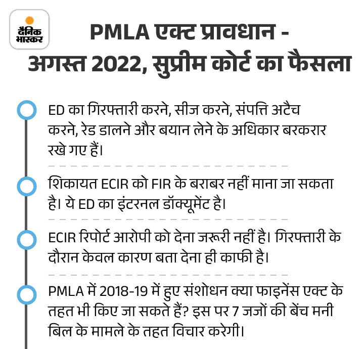 कहा था कि मनी लॉन्ड्रिंग दुनिया भर में एक बड़ी परेशानी है और ये कानून कोई आम कानून नहीं है। ED के अफसर पुलिस जैसे नहीं माने जाते और ECIR को FIR की तरह नहीं देखा जा सकता। हर केस में ECIR की कॉपी देना जरूरी नहीं है, बस गिरफ्तारी के वक्त वजह बताना काफी है।