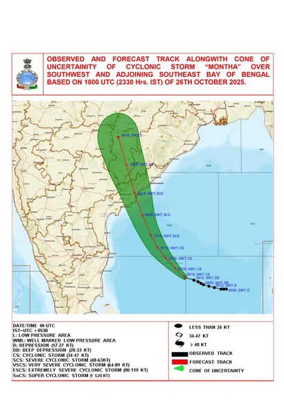 बंगाल की खाड़ी के ऊपर चक्रवाती तूफान मोंथा के सक्रिय होने के कारण ओडिशा में डिजास्टर मैनेजमेंट टीमों को हाई अलर्ट पर रखा गया है. 28 अक्टूबर को इसके आंध्र प्रदेश तट के पास पहुंचने की संभावना है. मौसम विभाग (IMD) के अनुसार, यह भीषण चक्रवाती तूफान 28 अक्टूबर को तटीय इलाकों से टकराने से पहले और तीव्र हो सकता है. 28 अक्टूबर को आंध्र प्रदेश के तट पर 90-100 किलोमीटर प्रति घंटे की रफ्तार से हवाएं चलने की आशंका है. चक्रवात के नज़दीक आने के साथ ही, मौसम विभाग (IMD) ने अगले कुछ दिनों के लिए ओडिशा, तमिलनाडु, आंध्र प्रदेश और पुडुचेरी जैसे राज्यों में भारी बारिश की चेतावनी जारी की है.