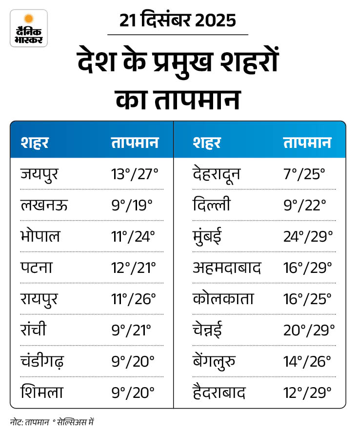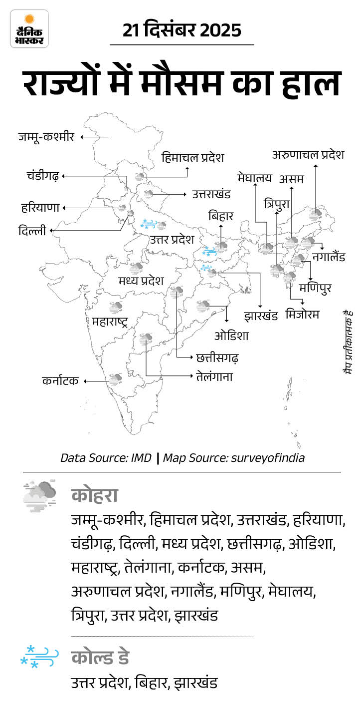 22 दिसंबर: 2 राज्यों में बहुत घना कोहरा, पहाड़ों में सर्दी का असर