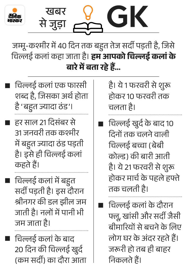 जम्मू-कश्मीर में 21 दिसंबर से चिल्लई कलां की शुरुआत हुई है। चिल्लई फारसी शब्द है, हिंदी में इसका मतलब ‘बहुत ज्यादा सर्दी’ होता है। अब अगले 40 दिन यहां काफी बर्फबारी की संभावना होगी।