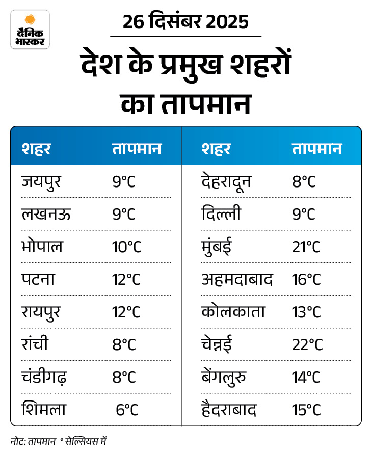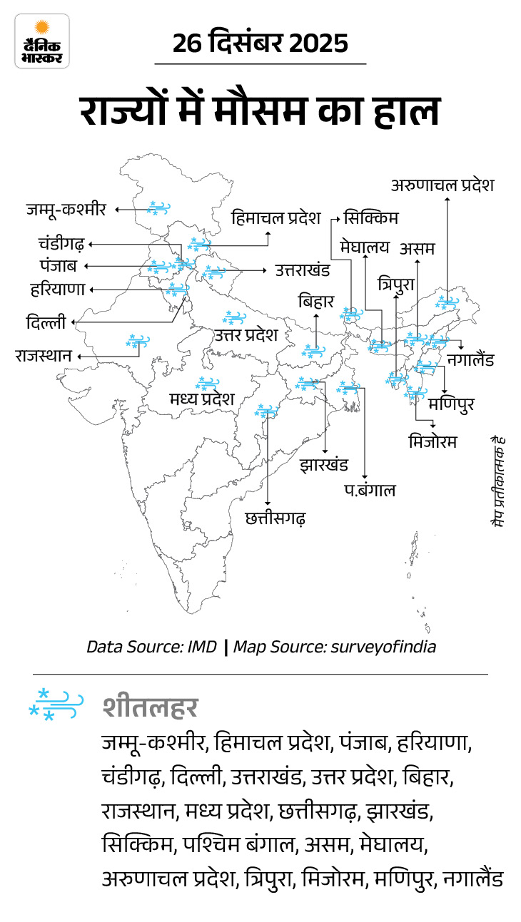 - जम्मू-कश्मीर और हिमाचल प्रदेश में न्यूनतम तापमान में और गिरावट के साथ शीतलहर जारी रहेगी।