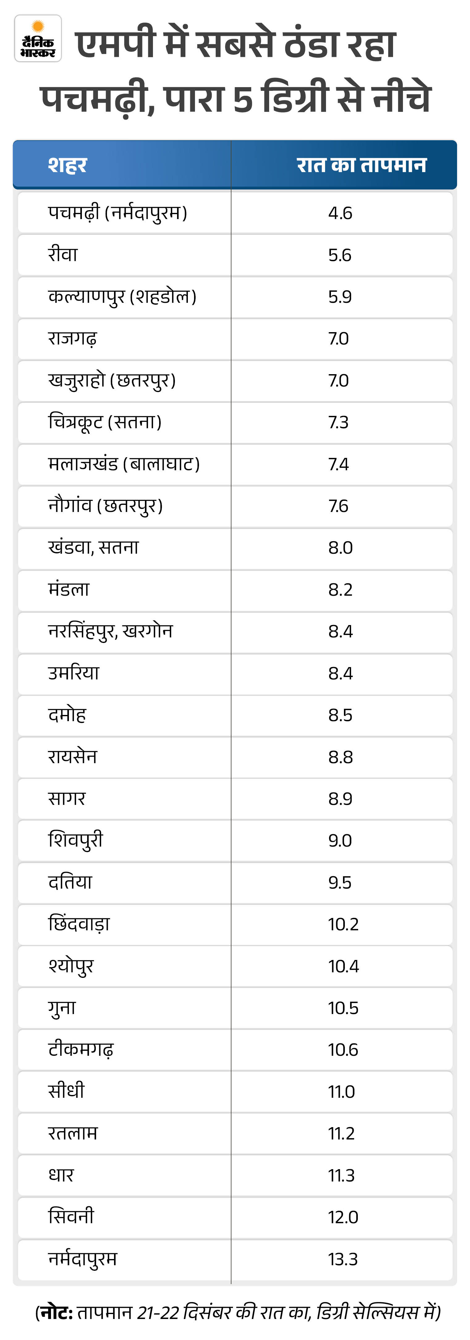 रीवा में 5.6 डिग्री, शहडोल के कल्याणपुर में 5.9 डिग्री, राजगढ़-खजुराहो में 7 डिग्री, सतना के चित्रकूट में 7 डिग्री, मलाजखंड में 7.4 डिग्री, बैतूल में 7.5 डिग्री, नौगांव में 7.6 डिग्री, खंडवा-सतना में 8 डिग्री, मंडला में 8.2 डिग्री, नरसिंहपुर, खरगोन-उमरिया में 8.4 डिग्री, दमोह में 8.5 डिग्री, रायसेन में 8.8 डिग्री, सागर में 8.9 डिग्री, शिवपुरी में 9 डिग्री और दतिया में पारा 9.5 डिग्री सेल्सियस दर्ज किया गया।