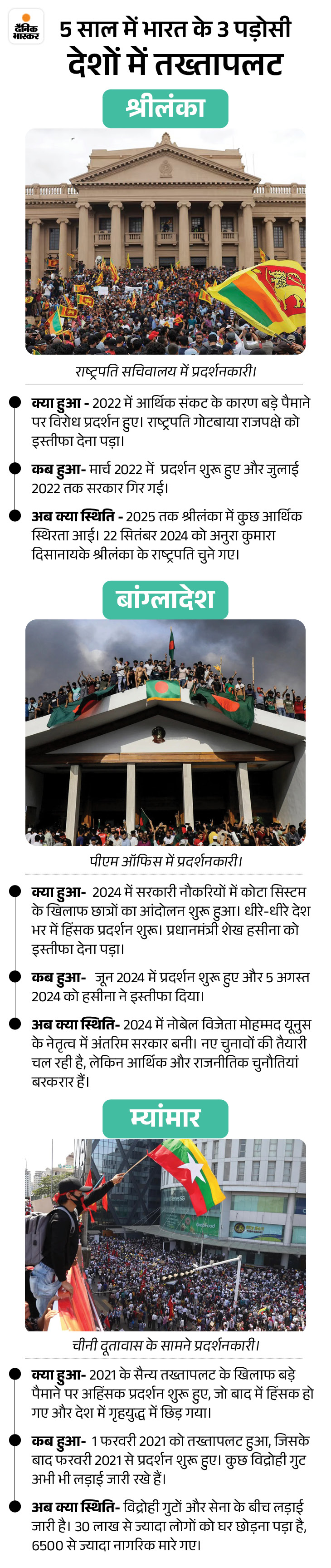 सितंबर में नेपाल में प्रदर्शन हुए थे, पीएम को इस्तीफा देना पड़ा नेपाल में सितंबर में Gen-Z (जेन-जी) ने प्रदर्शन किया था। प्रदर्शनकारियों ने संसद, पीएम, राष्ट्रपति के निजी आवास में आग लगा दी थी। सुरक्षा बलों से उनके हथियार छीन लिए। उन्होंने 3 पूर्व पीएम के घर पर हमला भी किया था। इसके चलते केपी ओली को प्रधानमंत्री पद से इस्तीफा देना पड़ा। प्रदर्शन में 70 से ज्यादा लोगों की मौत हो गई। (पढ़ें, नेपाल में क्यों हुआ प्रदर्शन)
